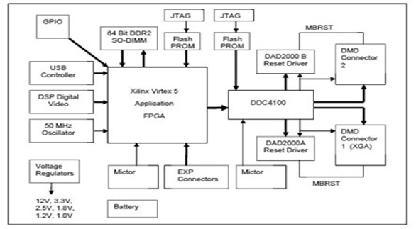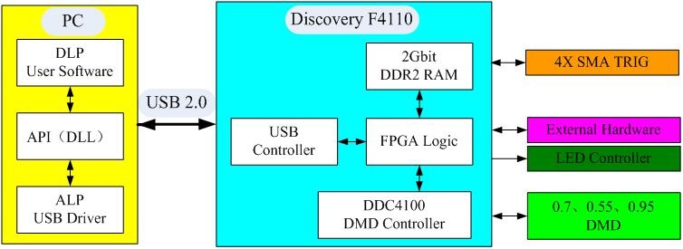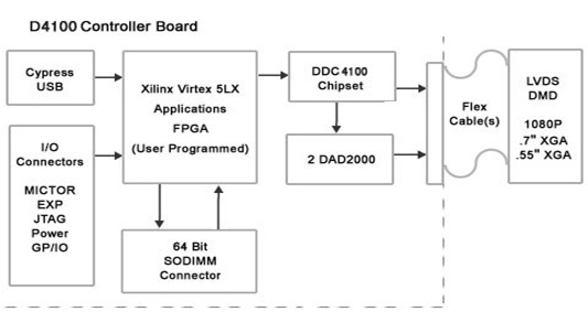- F4100 系統(tǒng)在DLP 開(kāi)發(fā)應(yīng)用中提供完整的接口(USB 或擴(kuò)展接口),數(shù)據(jù)處理(Virtex-5、DDR),DMD 控制器(DDC4100、DAD2000、DMD),左圖是F4100控制平臺(tái)的簡(jiǎn)化原理框圖: